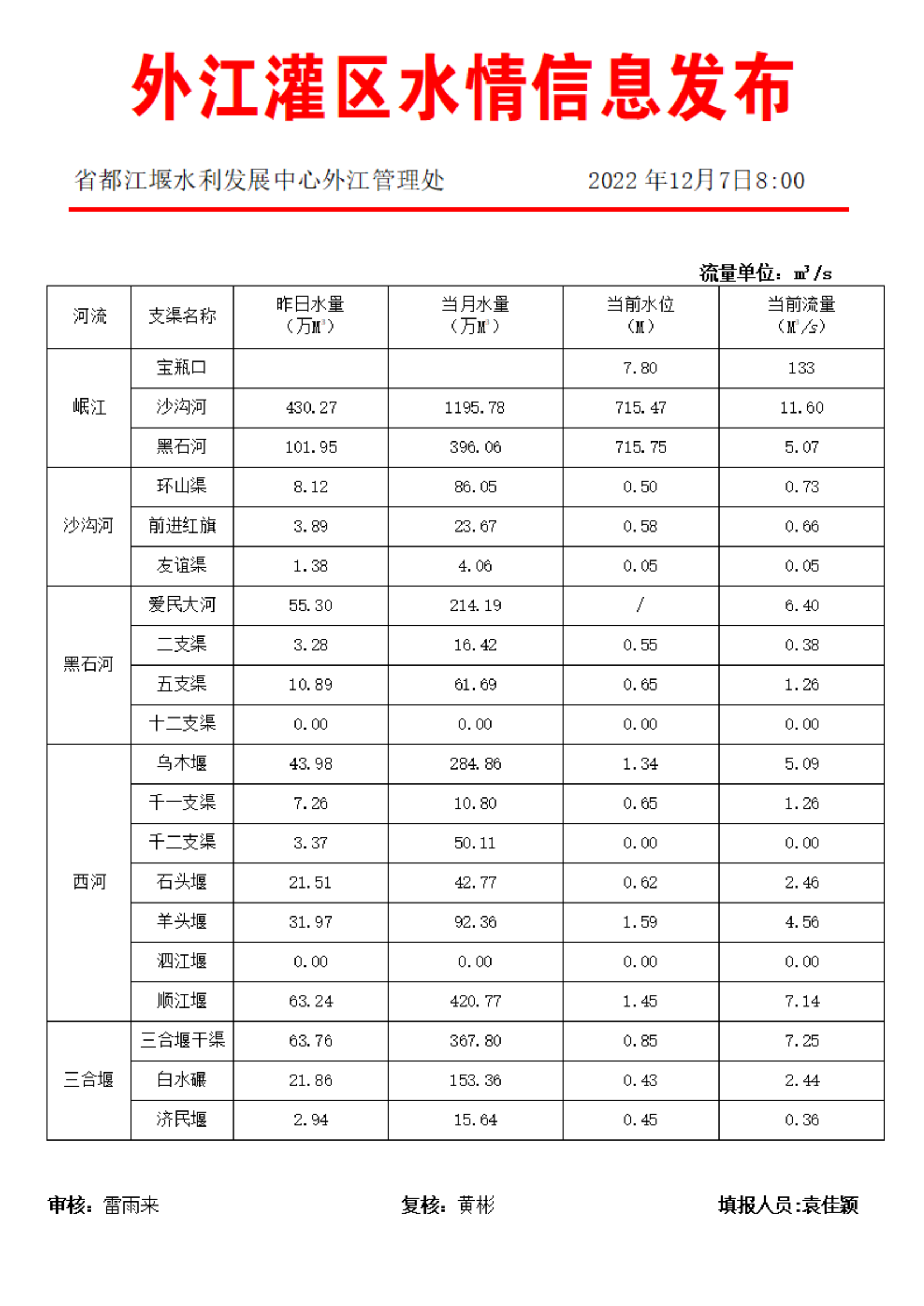 外江管理处各支渠水位、流量日报表(2022年12月7日8时)