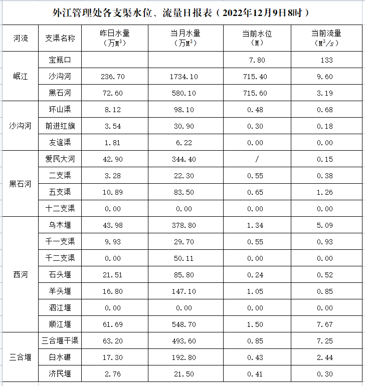 外江管理处各支渠水位、流量日报表(2022年12月9日8时)