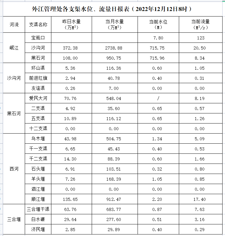 外江管理处各支渠水位、流量日报表(2022年12月12日8时)