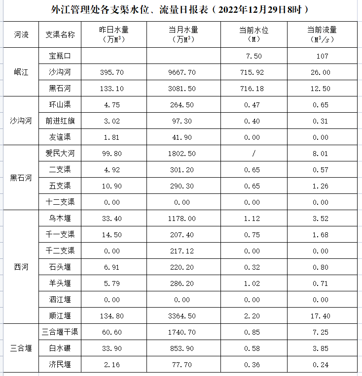 外江管理处各支渠水位、流量日报表(2022年12月29日8时)