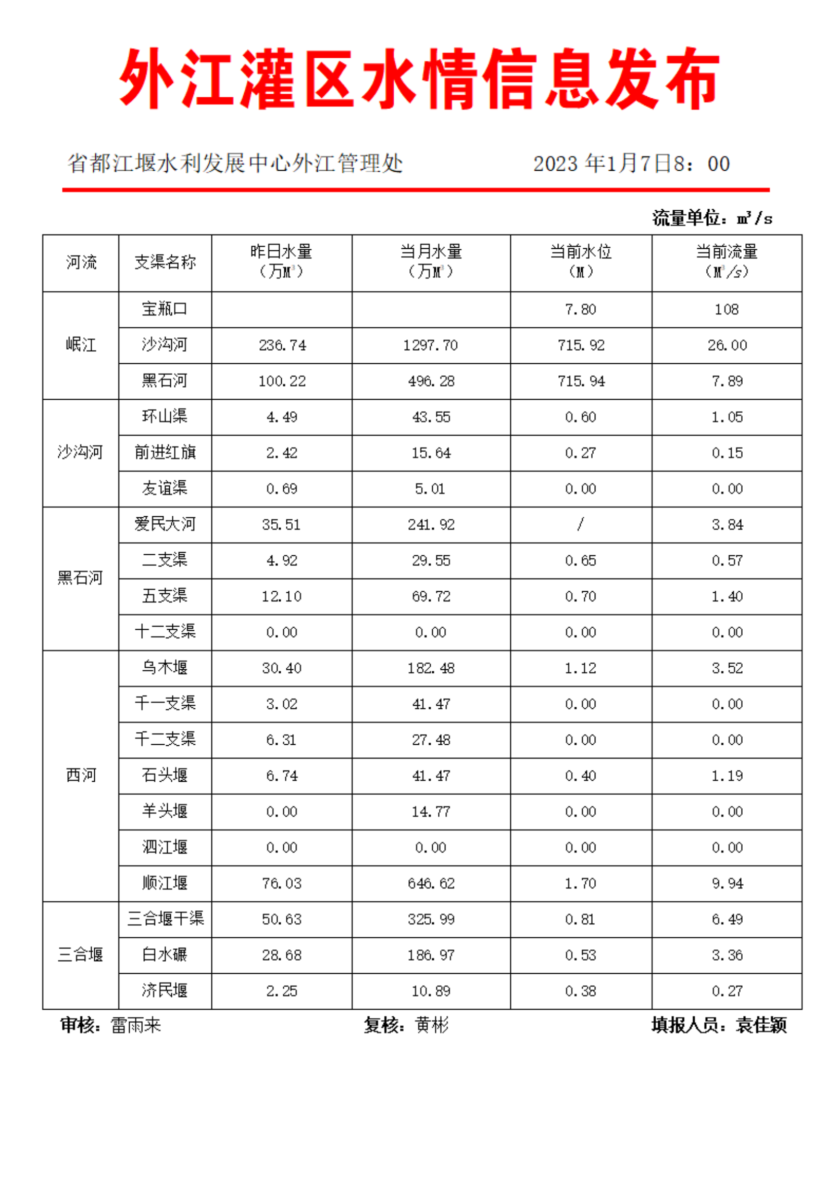 外江管理处各支渠水位、流量日报表(2023年1月7日8时)