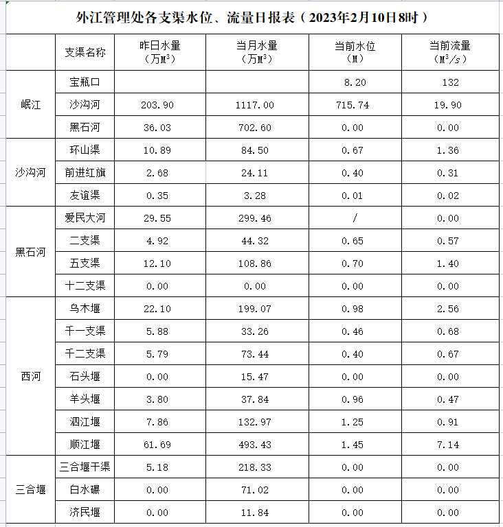 外江管理处各支渠水位、流量日报表(2023年2月10日8时)