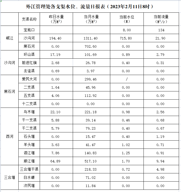 外江管理处各支渠水位、流量日报表(2023年2月11日8时)