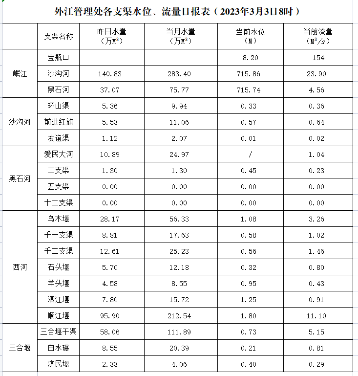外江管理处各支渠水位、流量日报表(2023年3月3日8时)
