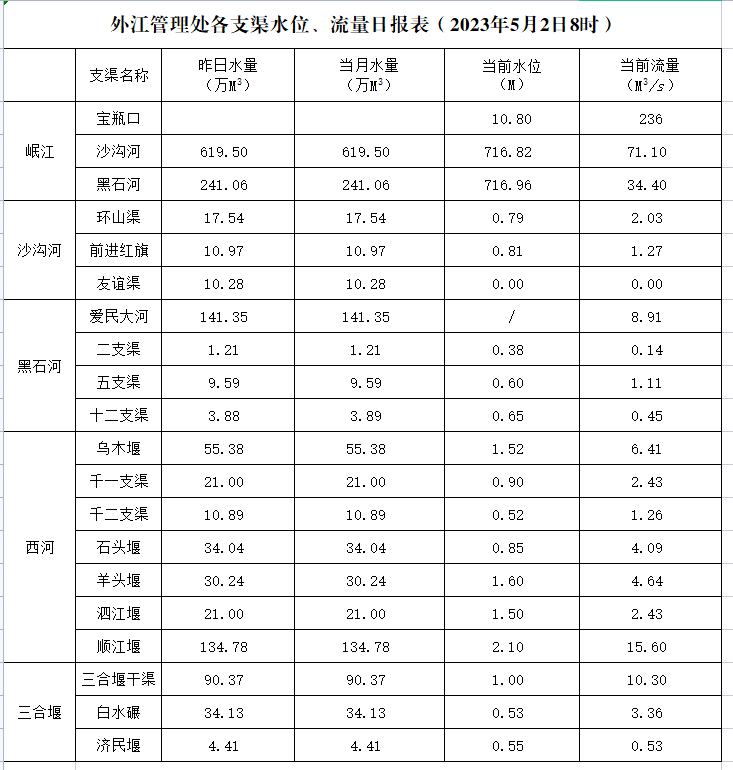 外江管理处各支渠水位、流量日报表(2023年5月2日8时)