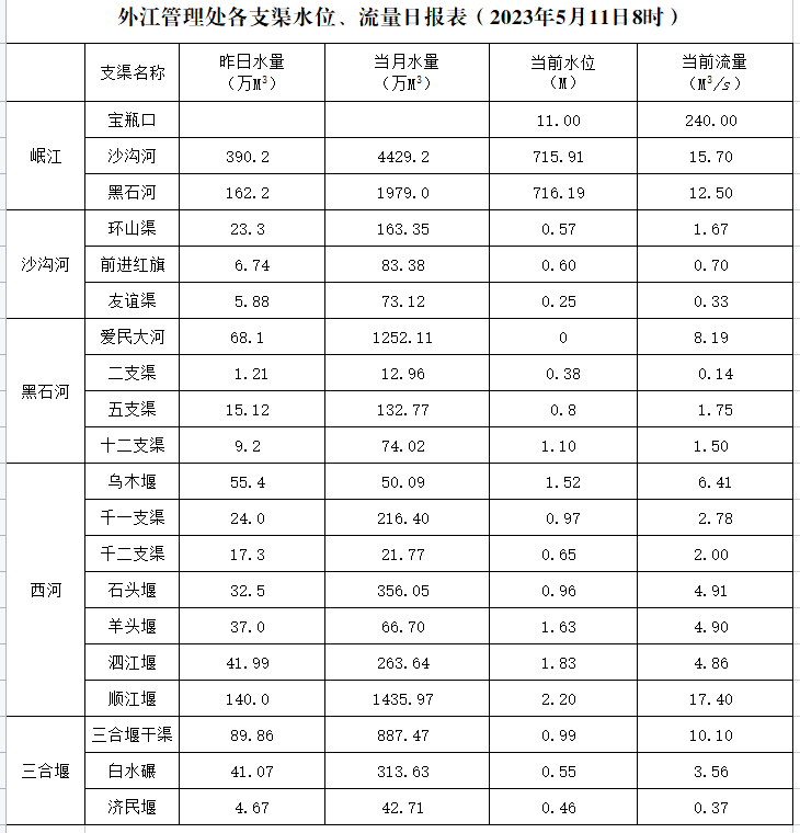 外江管理处各支渠水位、流量日报表(2023年5月11日8时)