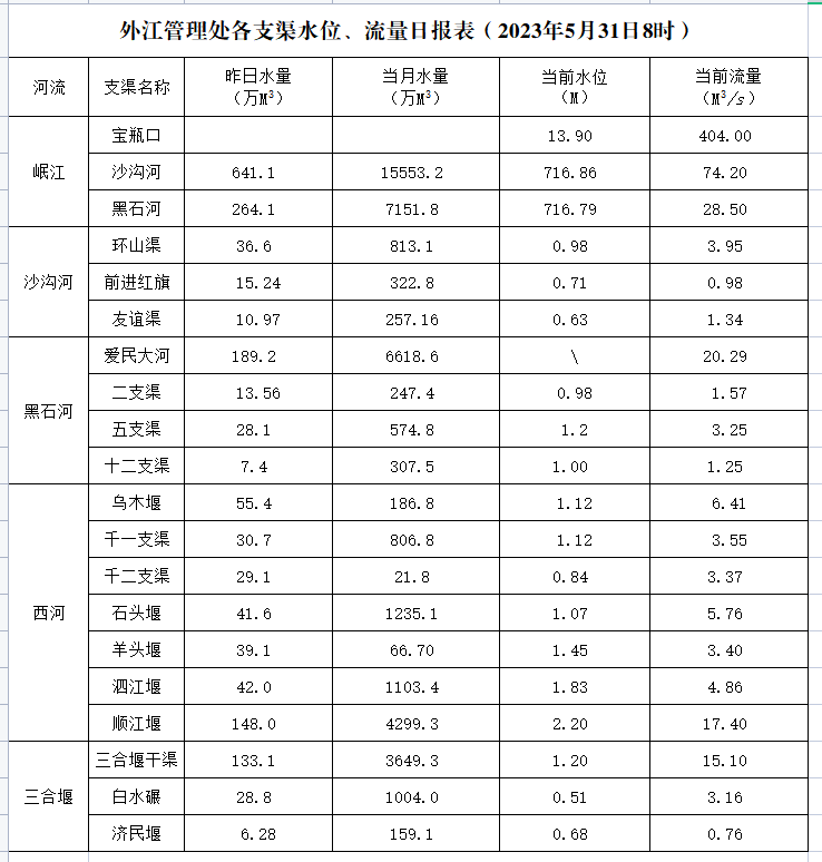 外江管理处各支渠水位、流量日报表(2023年5月31日8时)
