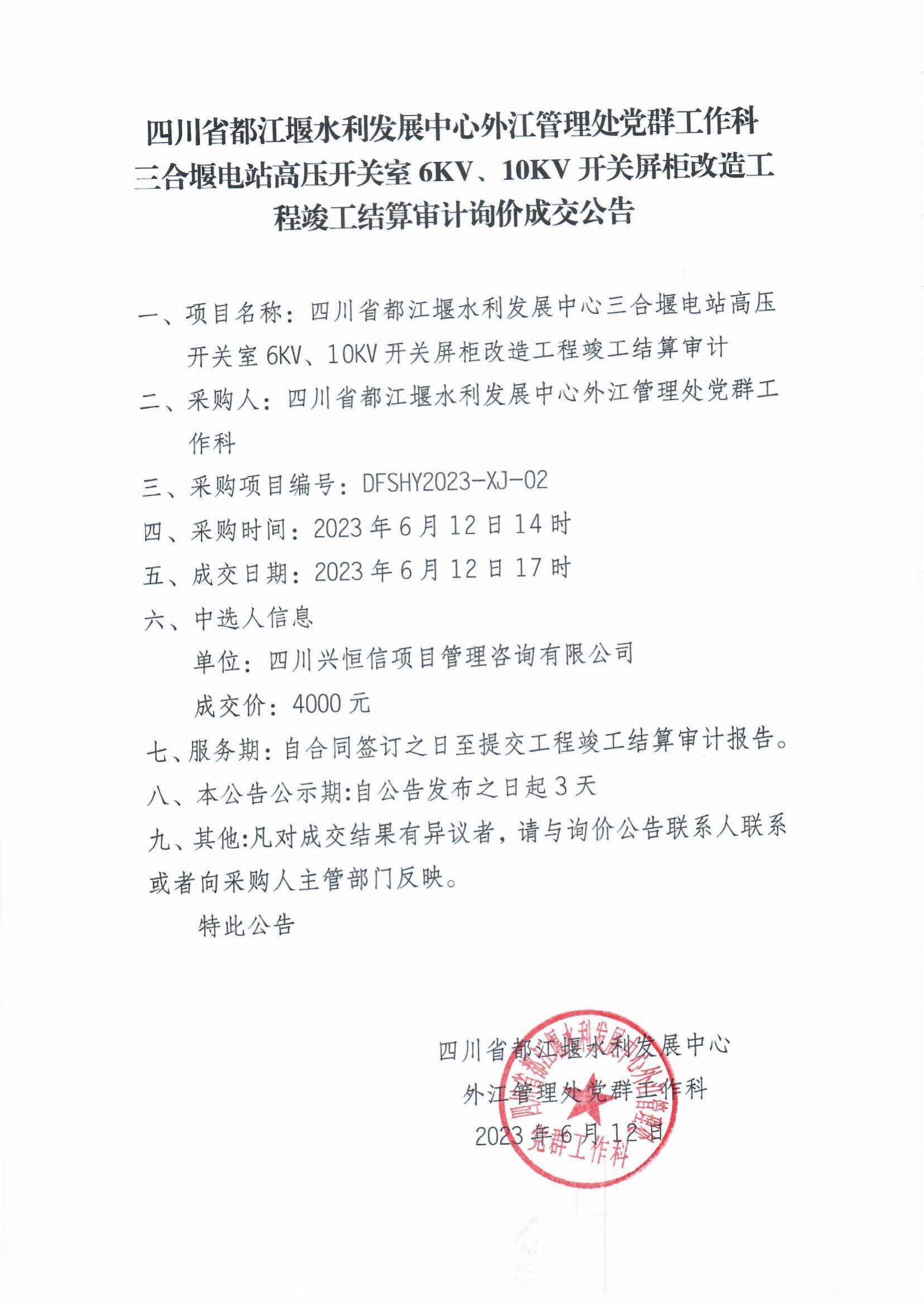 四川省都江堰水利发展中心外江管理处党群工作科三合堰电站高压开关室6KV、10KV开关屏柜改造工程竣工结算审计询价成交公告