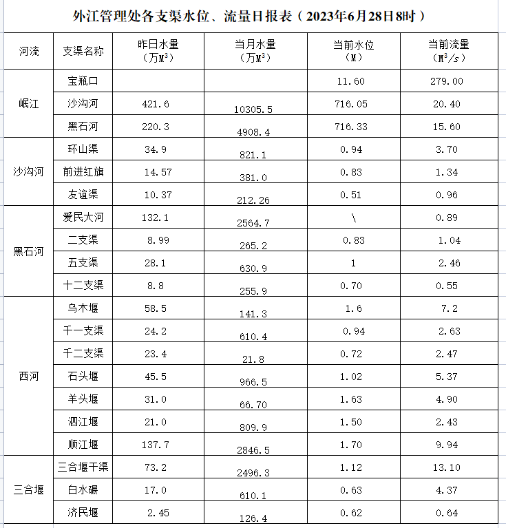 外江管理处各支渠水位、流量日报表(2023年6月28日8时)