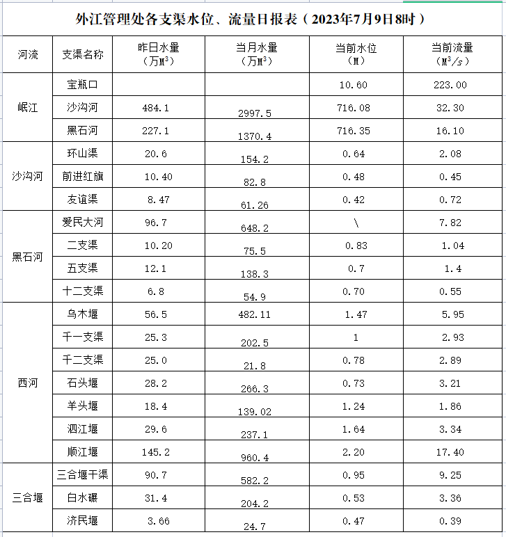 外江管理处各支渠水位、流量日报表(2023年7月9日8时)