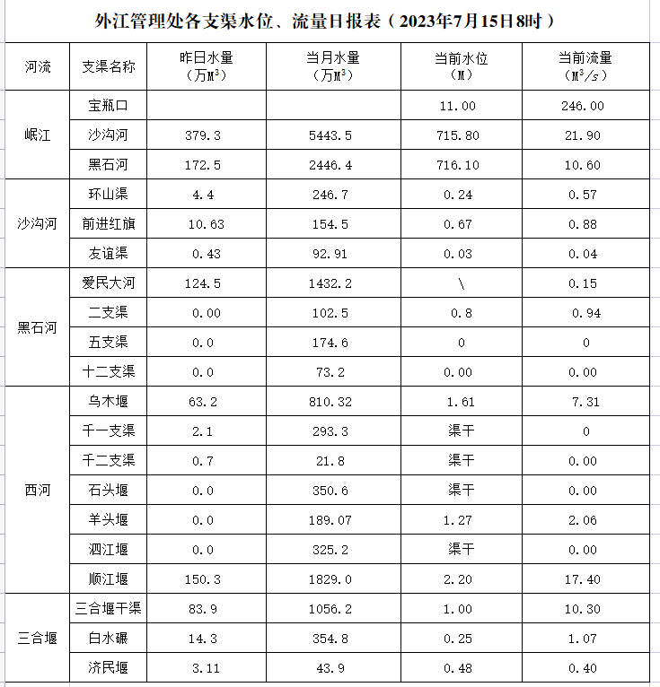 外江管理处各支渠水位、流量日报表(2023年7月15日8时)