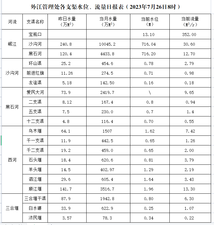 外江管理处各支渠水位、流量日报表(2023年7月26日8时)