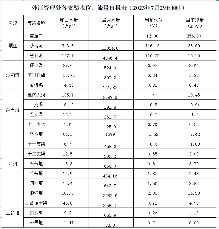 江管理处各支渠水位、流量日报表(2023年7月29日8时)