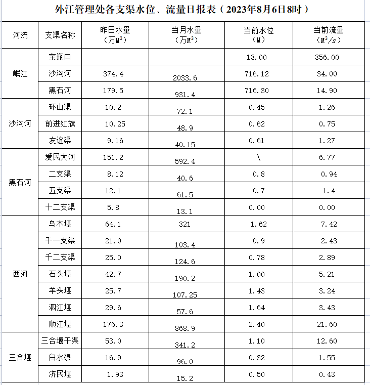 外江管理处各支渠水位、流量日报表(2023年8月6日8时)