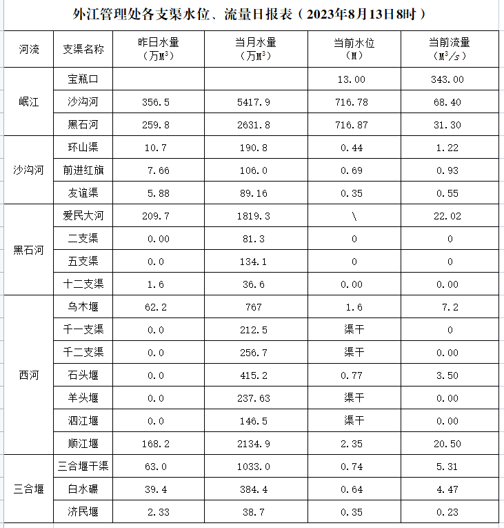 外江管理处各支渠水位、流量日报表(2023年8月13日8时)