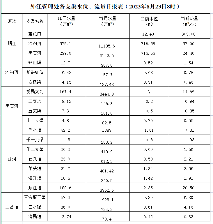 外江管理处各支渠水位、流量日报表(2023年8月23日8时)