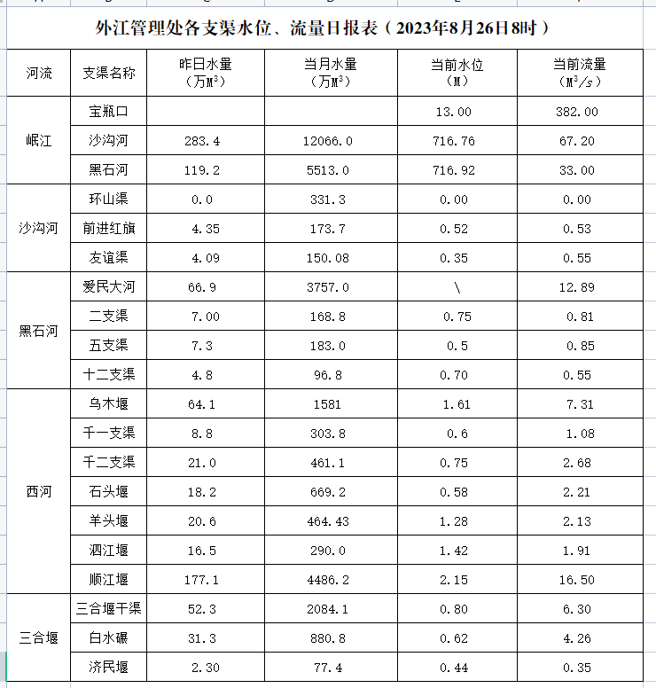 外江管理处各支渠水位、流量日报表(2023年8月26日8时)