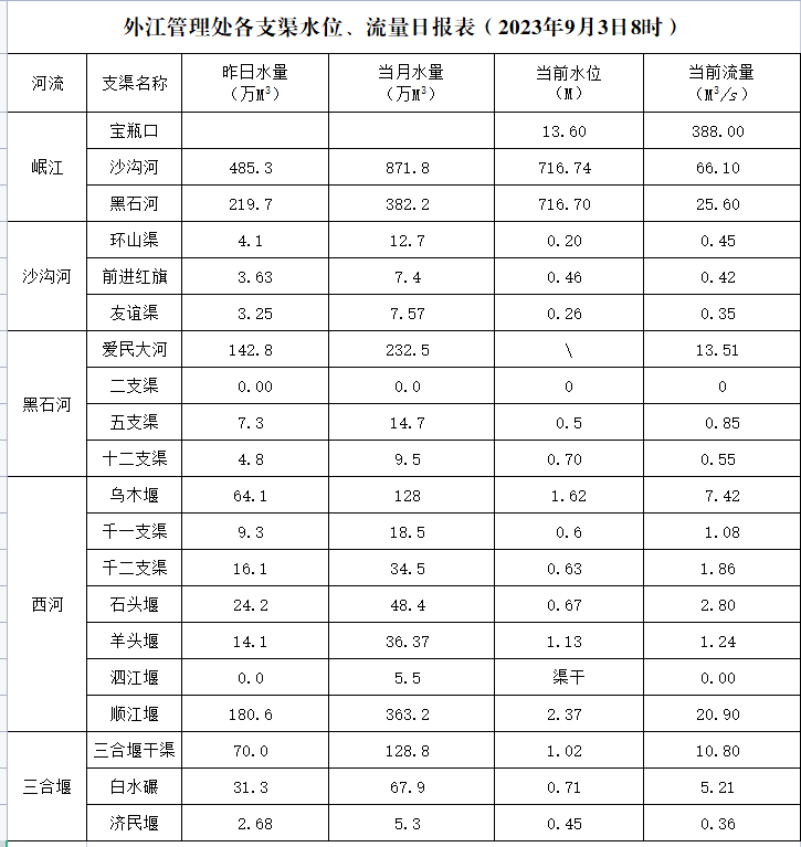 外江管理处各支渠水位、流量日报表(2023年9月3日8时)