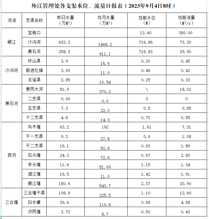 外江管理处各支渠水位、流量日报表(2023年9月4日8时)