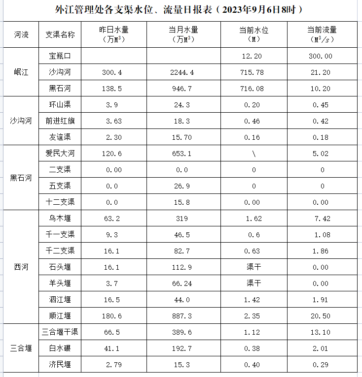 外江管理处各支渠水位、流量日报表(2023年9月6日8时)