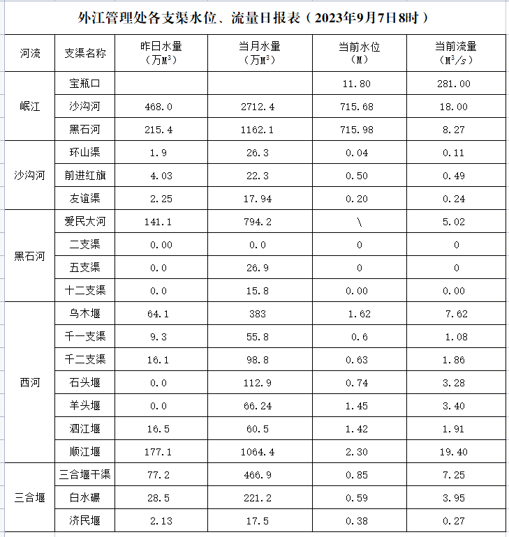 外江管理处各支渠水位、流量日报表(2023年9月7日8时)