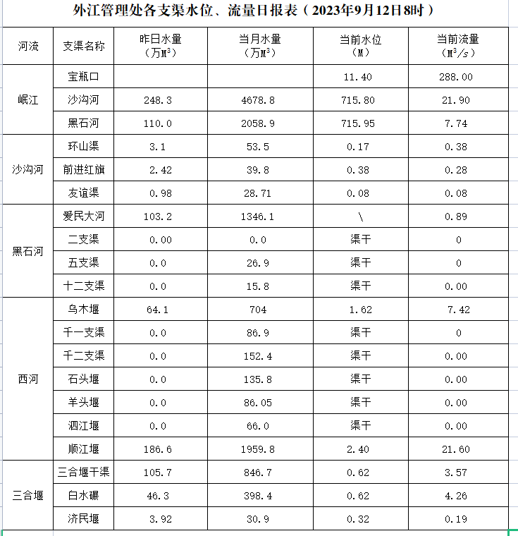 外江管理处各支渠水位、流量日报表(2023年9月12日8时)