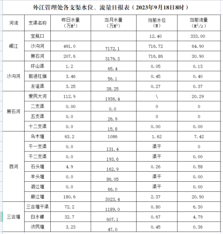 外江管理处各支渠水位、流量日报表(2023年9月18日8时)