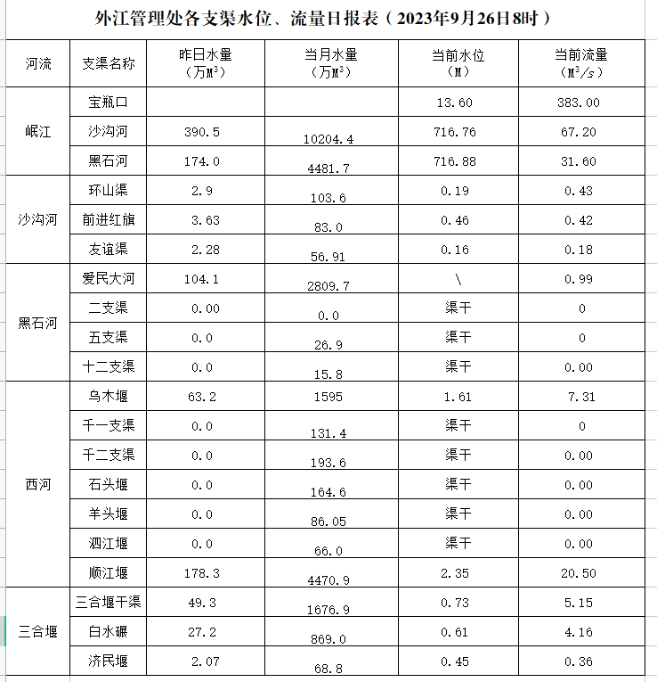外江管理处各支渠水位、流量日报表(2023年9月26日8时)