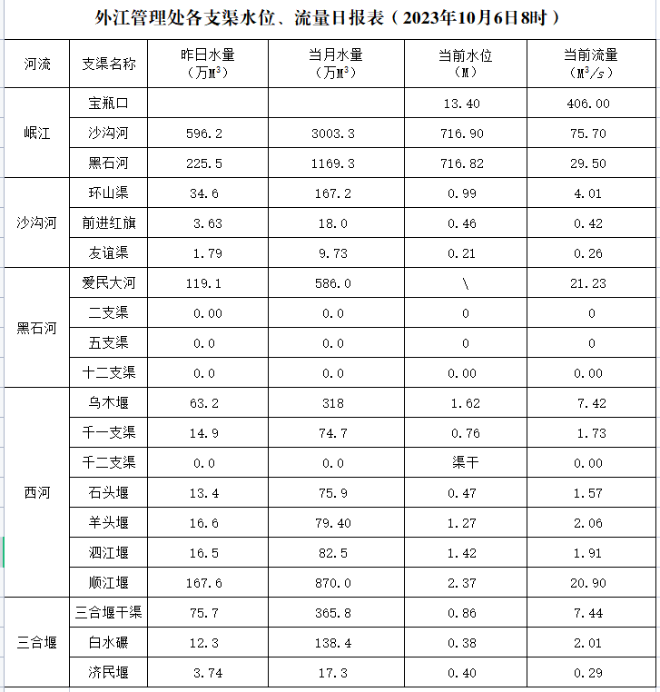 外江管理处各支渠水位、流量日报表(2023年10月6日8时)