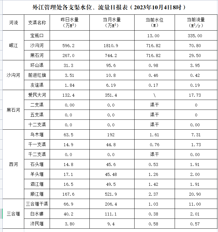 外江管理处各支渠水位、流量日报表(2023年10月4日8时)