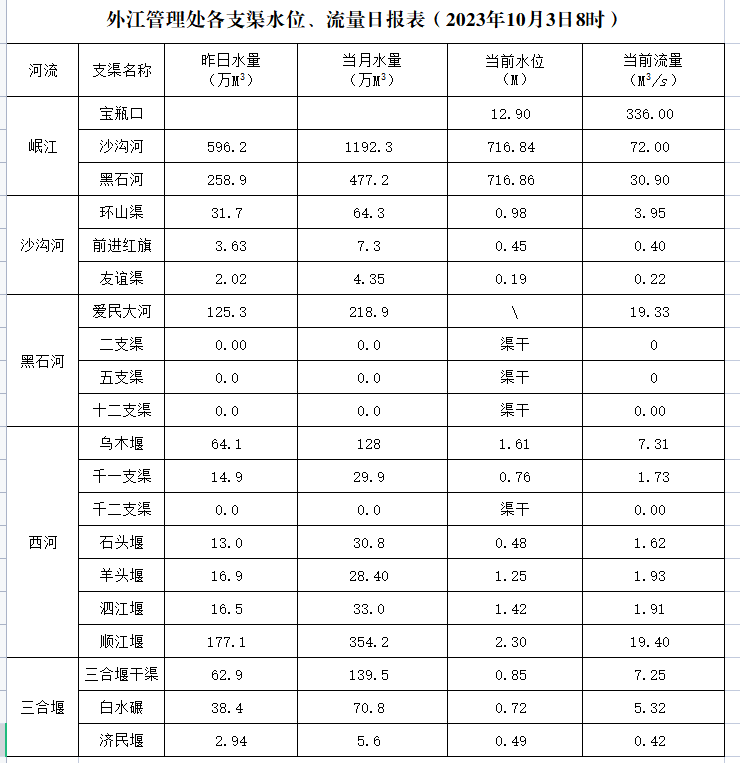 外江管理处各支渠水位、流量日报表(2023年10月3日8时)