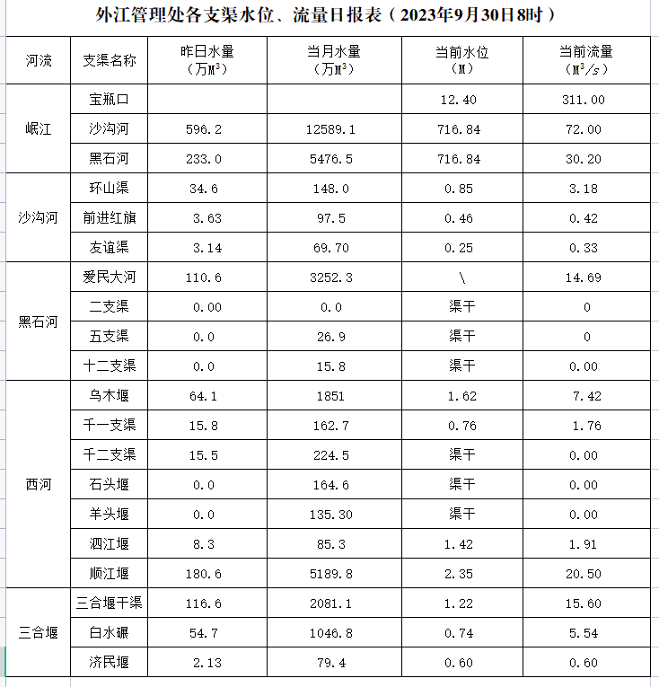 外江管理处各支渠水位、流量日报表(2023年9月30日8时)