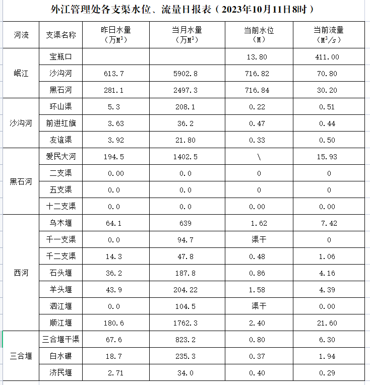 外江管理处各支渠水位、流量日报表(2023年10月11日8时)