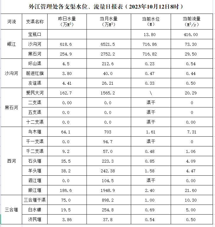 外江管理处各支渠水位、流量日报表(2023年10月12日8时)