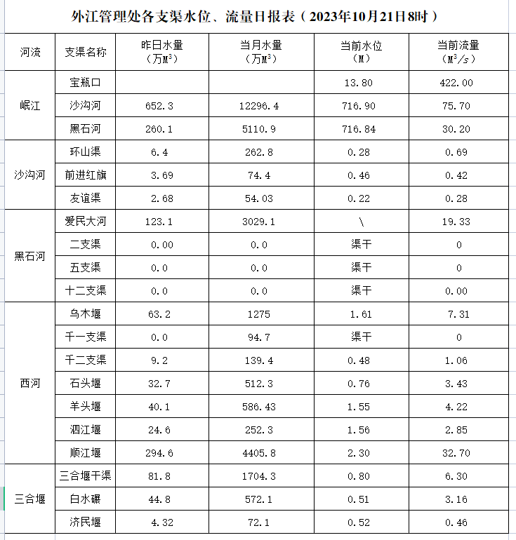 外江管理处各支渠水位、流量日报表(2023年10月21日8时)