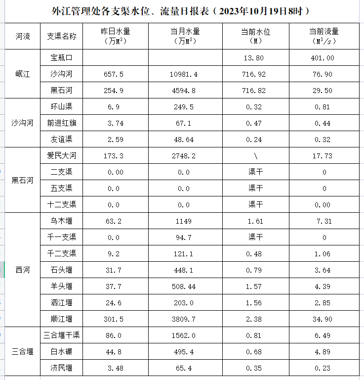 外江管理处各支渠水位、流量日报表(2023年10月19日8时)