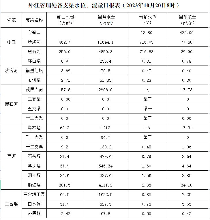 外江管理处各支渠水位、流量日报表(2023年10月20日8时)