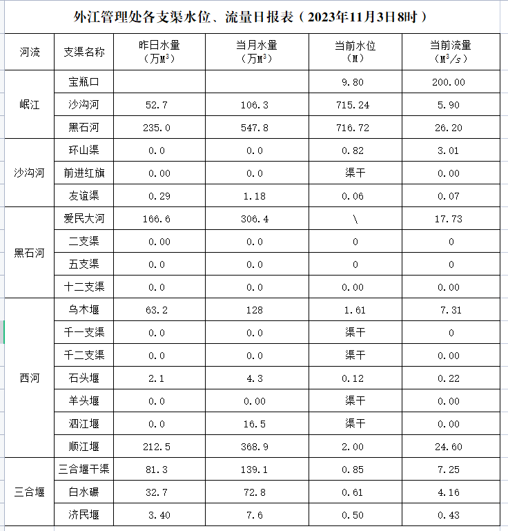 外江管理处各支渠水位、流量日报表(2023年11月3日8时)