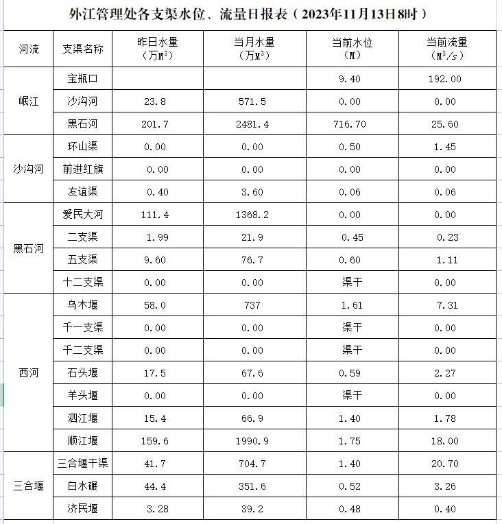 外江管理处各支渠水位、流量日报表(2023年11月13日8时)