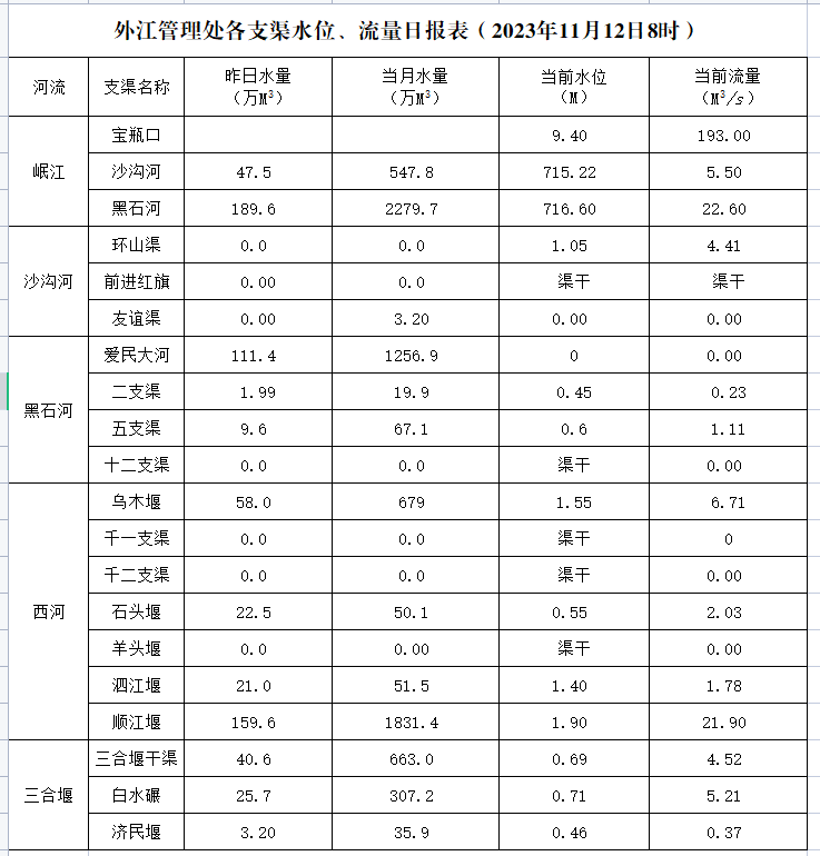 外江管理处各支渠水位、流量日报表(2023年11月12日8时)