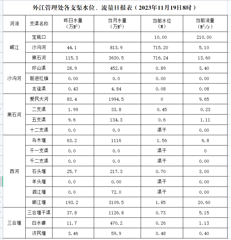 外江管理处各支渠水位、流量日报表(2023年11月19日8时)