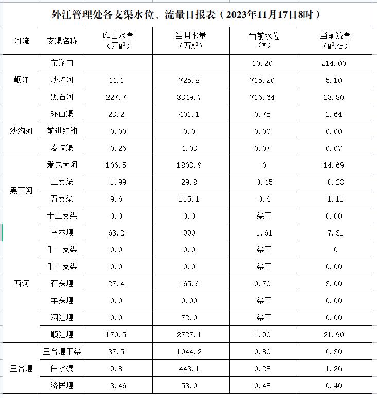 外江管理处各支渠水位、流量日报表(2023年11月17日8时)
