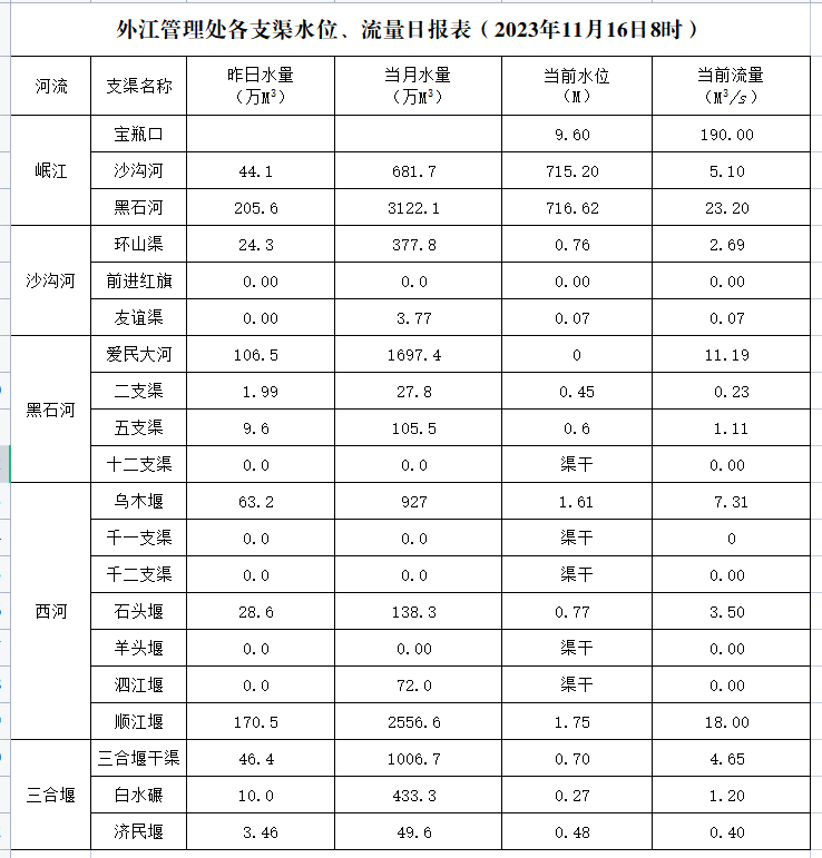 外江管理处各支渠水位、流量日报表(2023年11月16日8时)