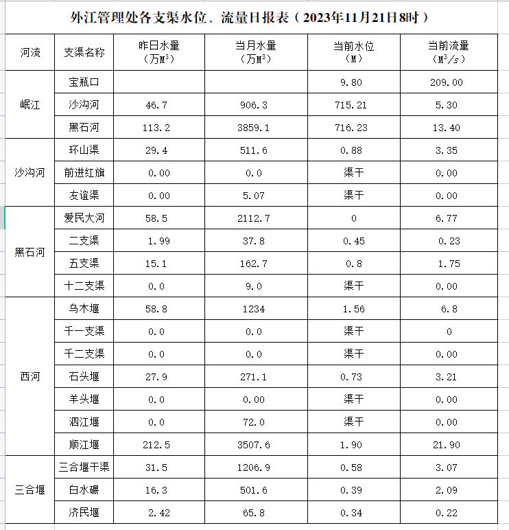 外江管理处各支渠水位、流量日报表(2023年11月21日8时)