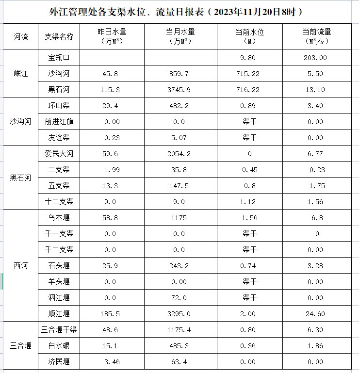外江管理处各支渠水位、流量日报表(2023年11月20日8时)