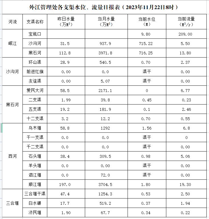 外江管理处各支渠水位、流量日报表(2023年11月22日8时)