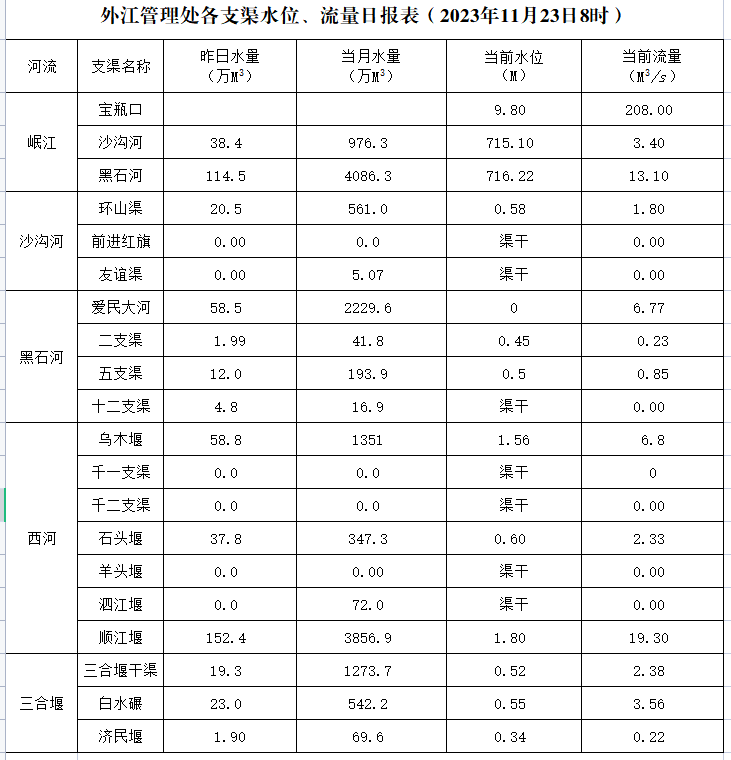 外江管理处各支渠水位、流量日报表(2023年11月23日8时)