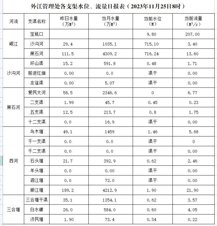 外江管理处各支渠水位、流量日报表(2023年11月25日8时)