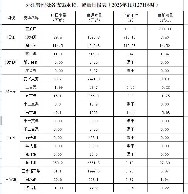 外江管理处各支渠水位、流量日报表(2023年11月27日8时)