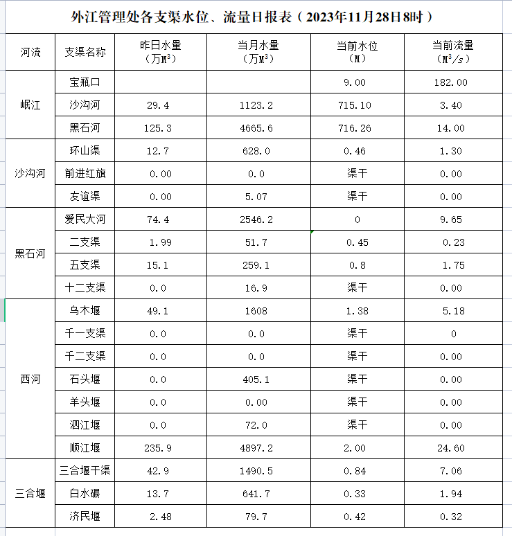 外江管理处各支渠水位、流量日报表(2023年11月28日8时)